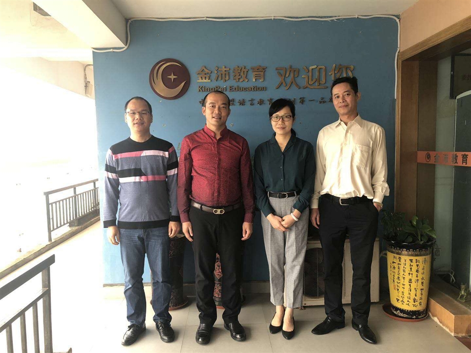 廣西金沛教育執行董事粟宥朝(左二)、國際部合伙人許顯鋒(左一)與廣西國際文化交流中心副秘書(shū)長(cháng)羅琨(右二)、經(jīng)濟科技部部長(cháng)吳偉(右一)一行合影留念