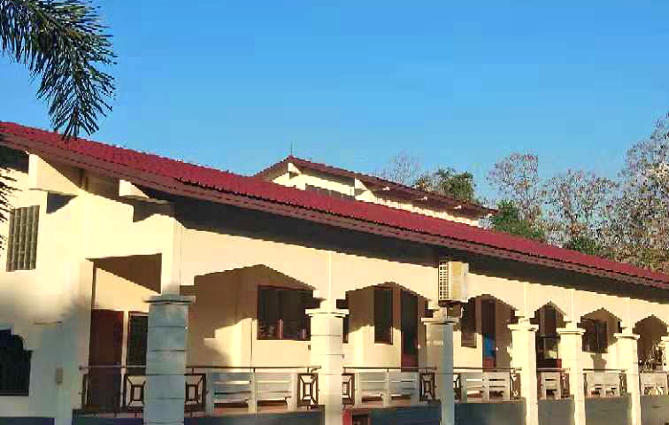 這是我上課的教學(xué)樓——語(yǔ)言學(xué)院,遵循著(zhù)“看人先看臉”的原則,我們先看一下它的外在環(huán)境??催^(guò)前幾期介紹的小伙伴不難發(fā)現,老撾國立大學(xué)的教學(xué)樓基本都是紅頂白墻,活潑跳躍的顏色彰顯著(zhù)這所學(xué)校的朝氣。