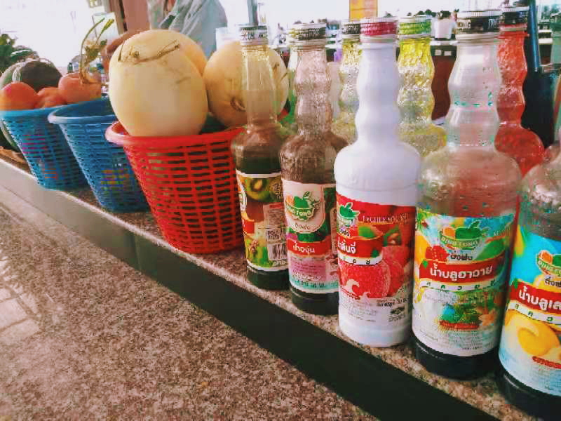 食堂的中間有鮮榨果汁售賣(mài),一瓶大概5000基普,折合成人民幣也就4塊左右。