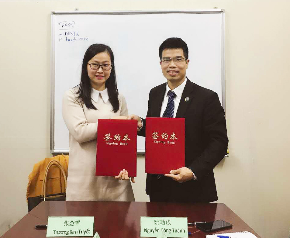 廣西金沛教育校長(cháng)張金雪(左一)與越南HICADO公司執行董事阮功成(右一)簽署協(xié)議