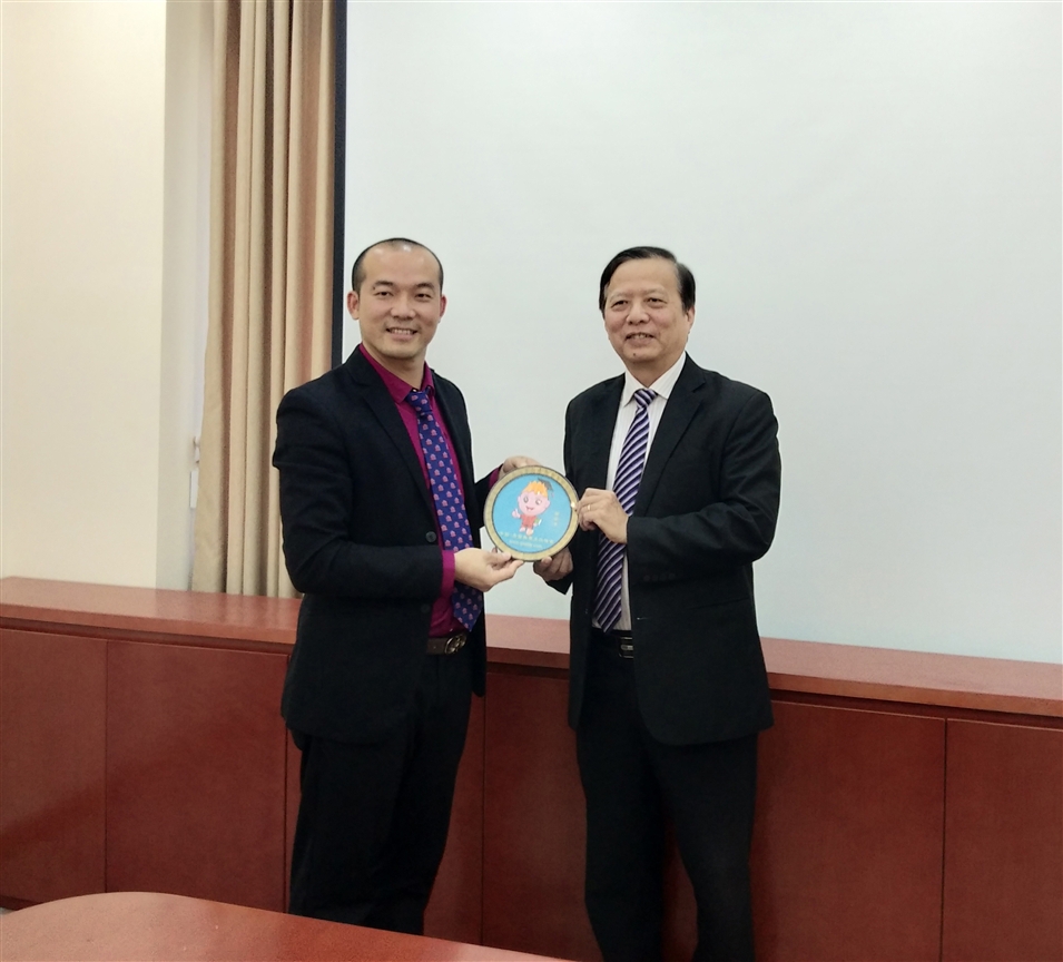 廣西金沛教育執行董事粟宥朝(左一)拜訪(fǎng)越南教育部國際合作司副司長(cháng)范志強(右一)并贈送吉祥物“金小沛”