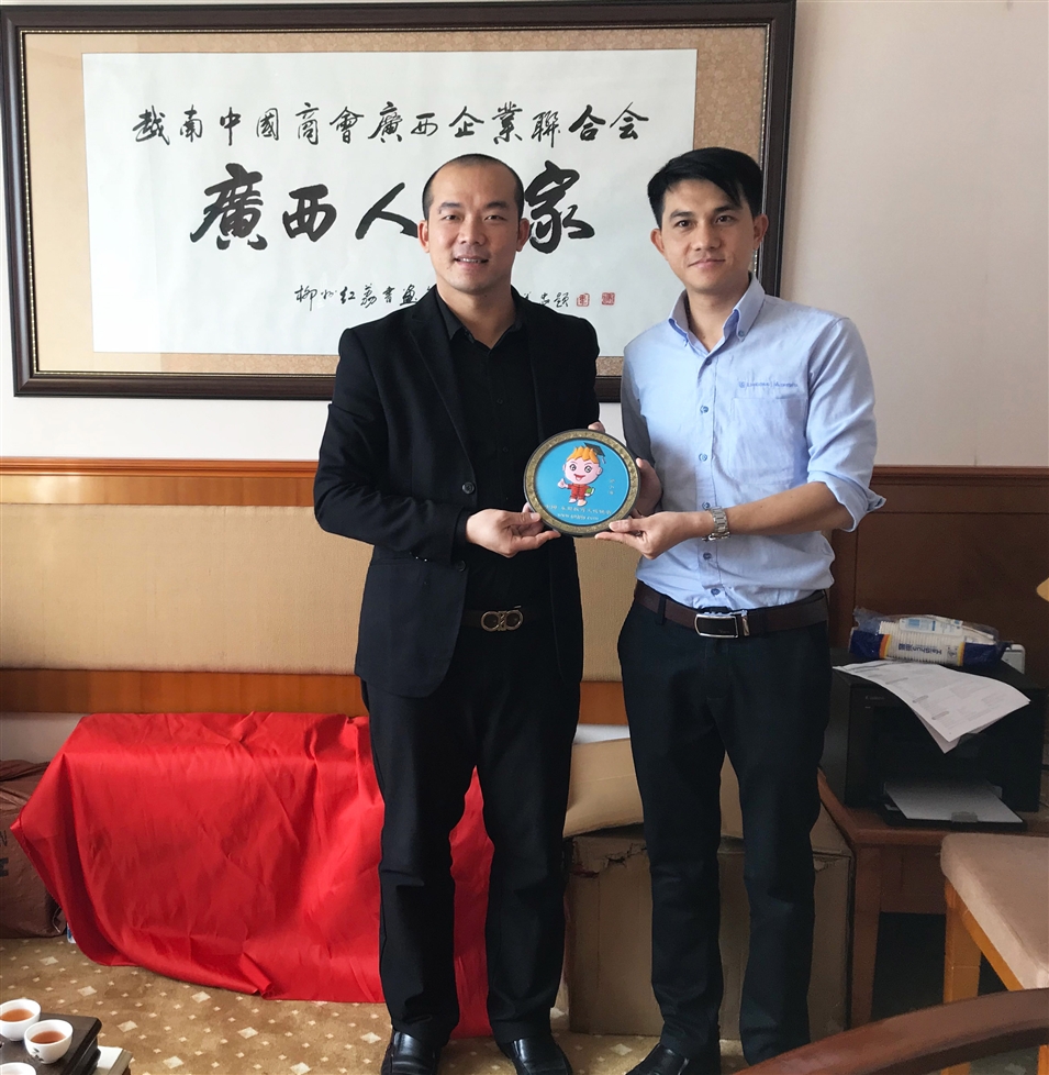 廣西金沛教育執行董事粟宥朝(左一)拜訪(fǎng)越南工商總會(huì )副主席黃光防(右一)并贈送吉祥物“金小沛”