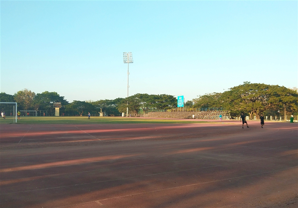 老撾國立大學(xué)的同學(xué)就很喜歡踢足球,足球場(chǎng)在學(xué)校的東面,球場(chǎng)正面是主席臺,側面還設有一處看臺,大約可以容納270名觀(guān)眾。跑道一圈也是400米,占地面積很大。球場(chǎng)中間的草是真草,有專(zhuān)門(mén)的人員養護。