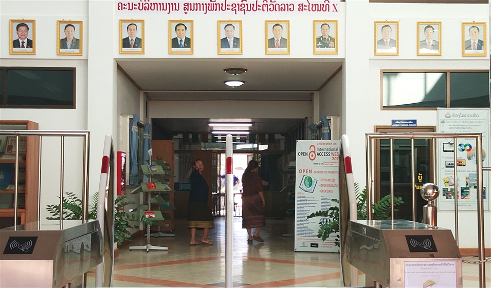 正對著(zhù)圖書(shū)館入口處的墻上掛著(zhù)一排相框,展示的是本屆老撾人民民主共和國中央領(lǐng)導的照片。