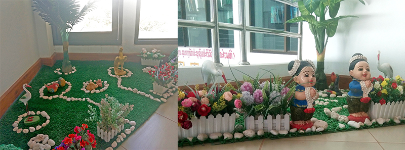 樓梯拐角處布置有陳設點(diǎn),用一些白色石頭拼湊圖案,輔以盆栽、鮮花、小人等裝飾,濃厚的學(xué)習氛圍中透出一絲活潑。