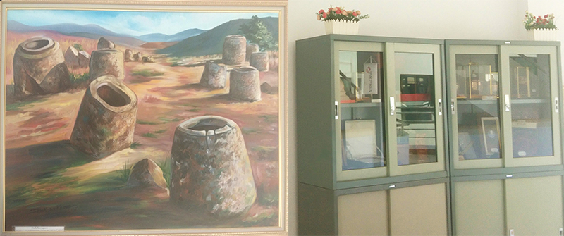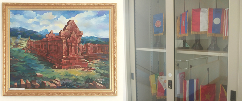 二樓樓梯拐角處掛著(zhù)老撾古老寺廟油畫(huà),旁邊的柜子里整齊擺放著(zhù)幾排各國國旗;三樓樓梯拐角處掛的則是川壙省石缸平原油畫(huà),旁邊的柜子里放置著(zhù)一些老撾紀念品。