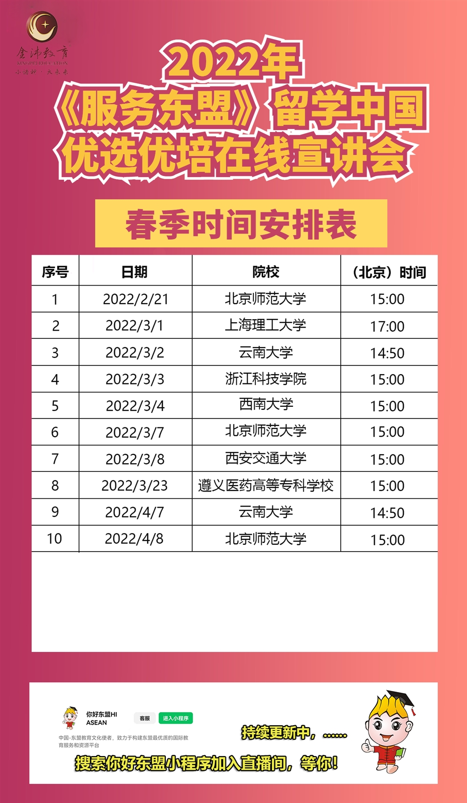 2022年2月21日起由我司聯(lián)合多所高校開(kāi)展的“2022年春季留學(xué)中國優(yōu)選優(yōu)培線(xiàn)上直播宣講會(huì )”將在“你好東盟”微信小程序上進(jìn)行開(kāi)播。