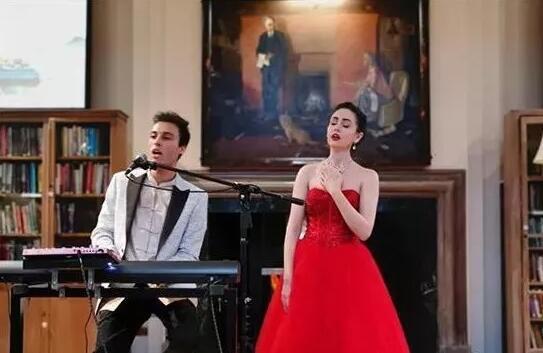 亞當·戴維斯(左)與菲比·海恩斯(右)在倫敦的孔子學(xué)院活動(dòng)上表演中文歌曲