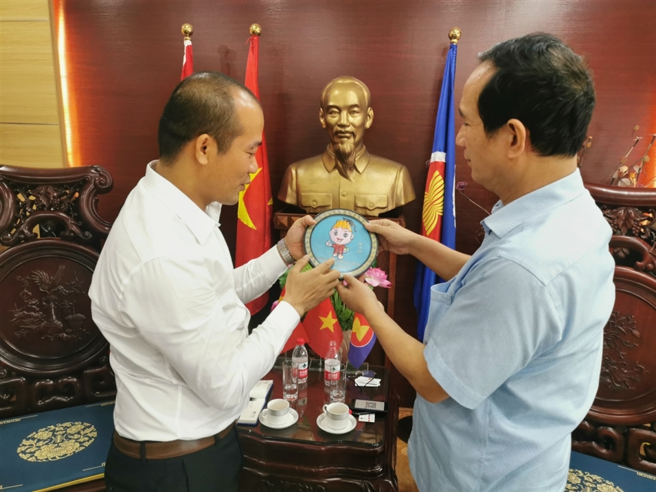 (廣西金沛教育執行董事粟宥朝先生向越南駐南寧總領(lǐng)事黃玉榮先生贈送金小沛紀念品)