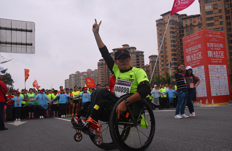 在眾多的選手中,坐在輪椅上的張先生顯得尤為搶眼。張先生來(lái)自廣州,他告訴記者,這是他參加的第54場(chǎng)馬拉松比賽,也是第一次參加全海景跑道的馬拉松, “我參加比賽不是為了出成績(jì)或出風(fēng)頭,而是重在參與,是想體現一種精神?!睆埾壬f(shuō),他不一定能全部“跑”完全程,但他一定會(huì )堅持到最后。