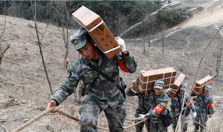 掃雷官兵在中越邊境廣西段某雷場(chǎng)搬運炸藥,準備爆破作業(yè)(12月22日攝)。掃雷官兵在作業(yè)前要對雷區進(jìn)行爆破作業(yè),清除雷場(chǎng)植被,方便后期搜排。
