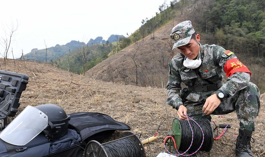 一名掃雷戰士在中越邊境廣西段某雷場(chǎng)檢查爆破線(xiàn)路