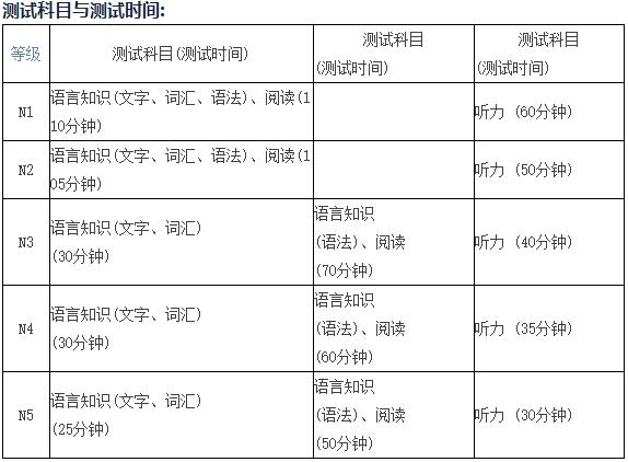 N3、N4、N5考試分"語(yǔ)言知識(文字、詞匯)";"語(yǔ)言知識(語(yǔ)法)、閱讀"及"聽(tīng)力"3個(gè)科目,滿(mǎn)分均為180分。